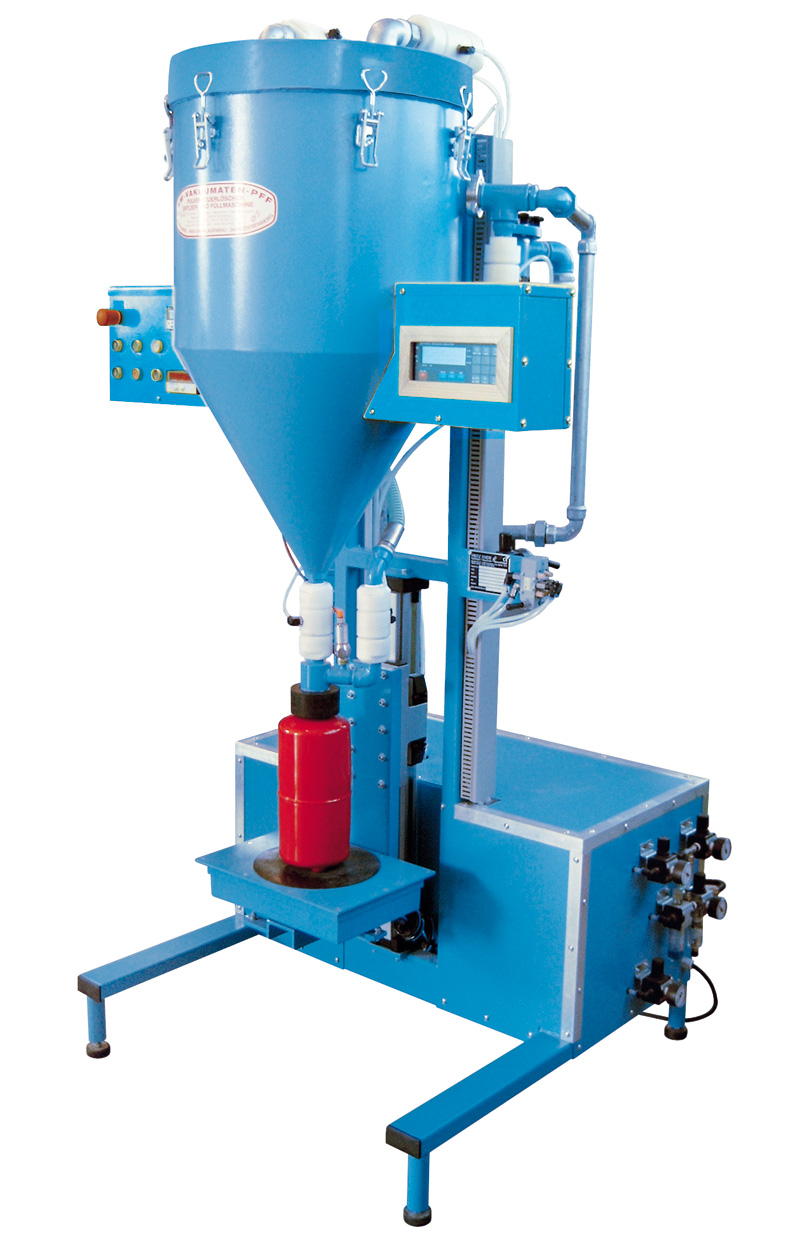 Plnění hasicího přístroje probíhá bez prašně z této nádoby na prášek přímo do hasicího přístroje. Přesné plnění je zajištěno pomocí digitální váhy. Požadovaná hmotnost se uloží na váze a po dosažení plněného množství váha plnicí proces automaticky vypne.