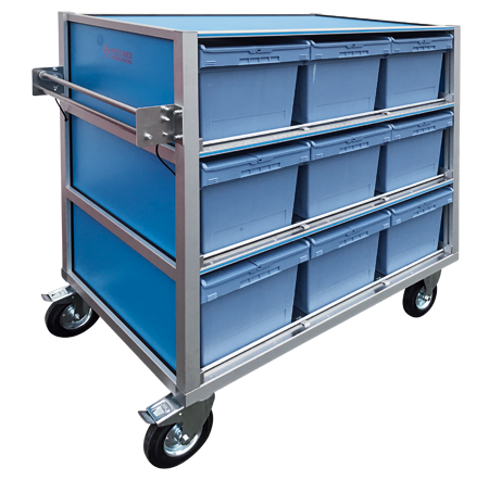 Az EMDE AT-DOBOZ kocsi három szinten, műanyag dobozokban* tárolt légzésvédő eszközök tárolására szolgál. A guruló konténer alumíniumból készült, és két kormányzó/fékes és két rögzített kerékkel rendelkezik.